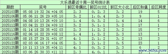 前区大小走势:上期前区大小比为2:3,上周一号码大小比3:2,最近十周一小 号略占上风,本期符合情切大号回补走热,看好大小比3:2。